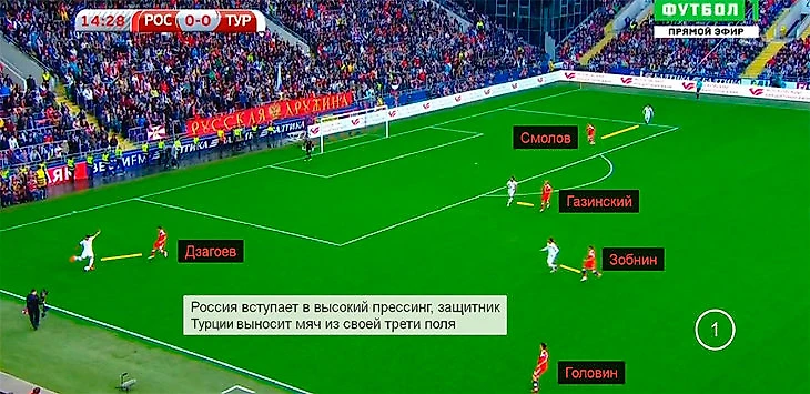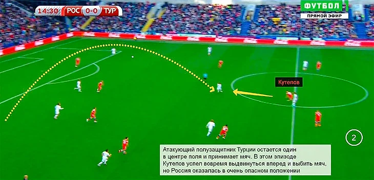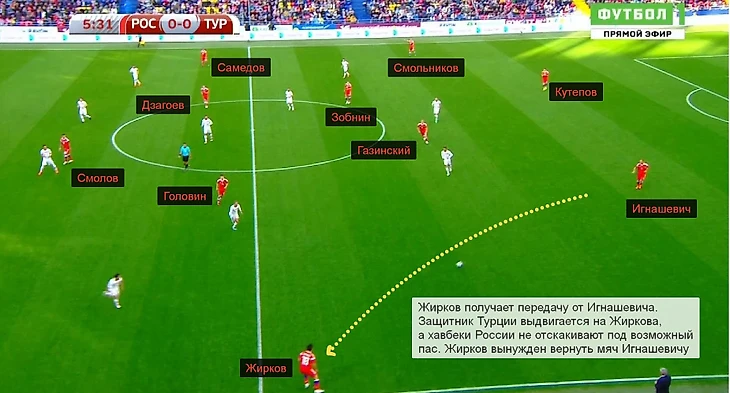 Турция без особых проблем находила свободные зоны у центрального круга и переводила мяч с одного фланга на другой. На ЧМ у России будут более качественные соперники (минимум два на групповом этапе), которые точно подготовятся к прессингу Черчесова и не будут выходить из обороны через короткий пас.