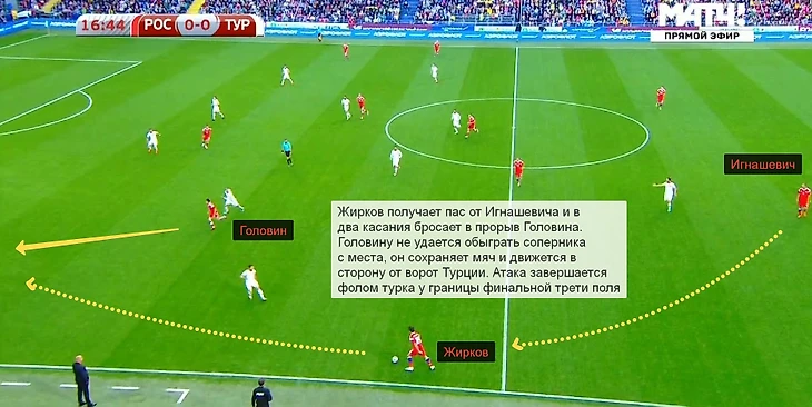 Иногда Головин успевал не только освободить край для Жиркова в первой фазе атаки, но и открыться под передачу от Юрия во фланг. В таких эпизодах у России получалось доставить мяч к штрафной, но с острым пасом к воротам турок возникали большие трудности.