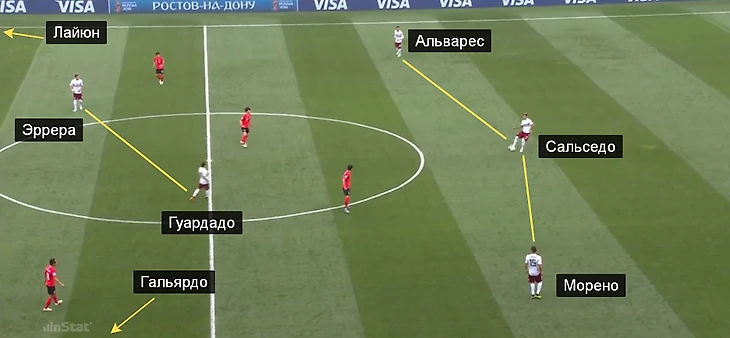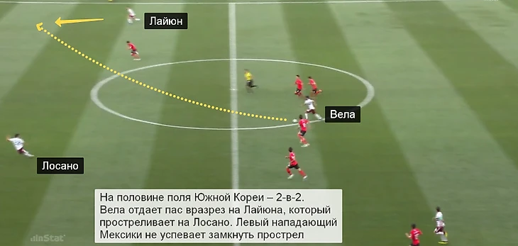 Вела был хорош и в позиционных атаках (9 точных пасов в финальной трети до перерыва, 3 удачных обводки из 3), но Лосано не мог попасть в створ (3 неточных удара), а Лайюн и Чичарито завязли в обороне Южной Кореи.