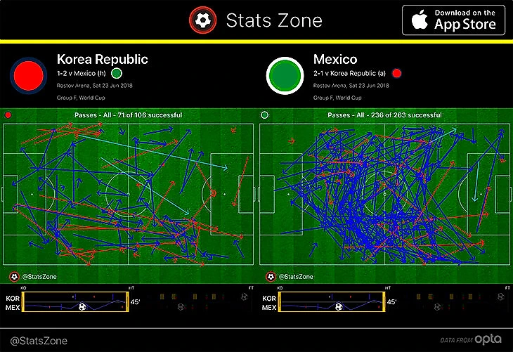 За центральный круг Мексика доставляла мяч без больших проблем, но дальше они возникали. Из 271 передачи мексиканцев до перерыва лишь 54 были направлены в финальную треть поля и всего 7 – в чужую штрафную. Корейцы отдали всего 122 паса, из которых 43 – в последнюю треть и 5 – к воротам Очоа.