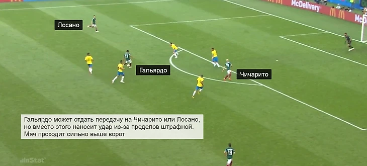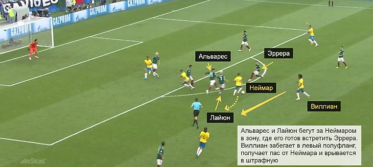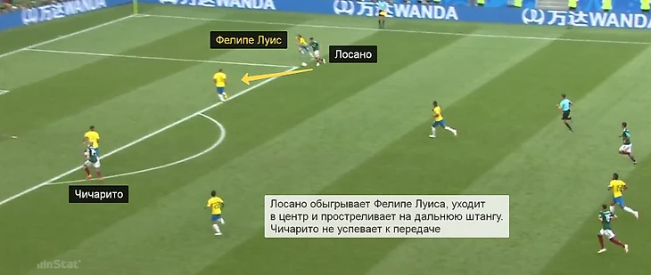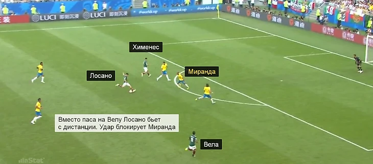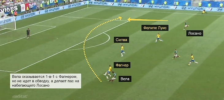 Еще одна фишка Мексики в игре с Бразилией – расположение Велы и Лосано. Вела, который в предыдущих матчах искал пространство между линиями соперников в центре, ушел налево, а Лосано перешел на правый край.