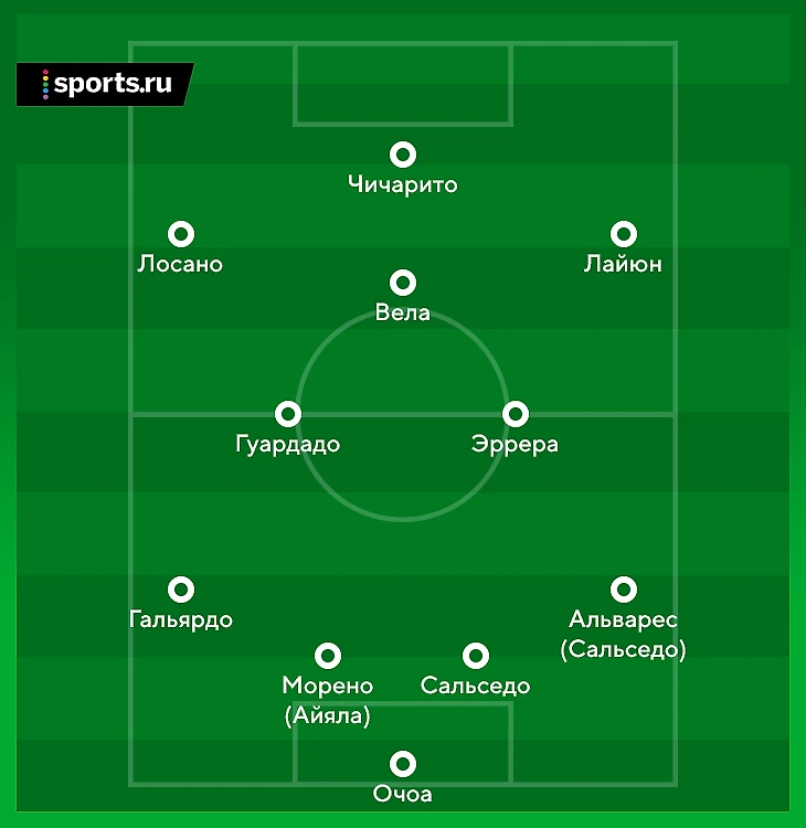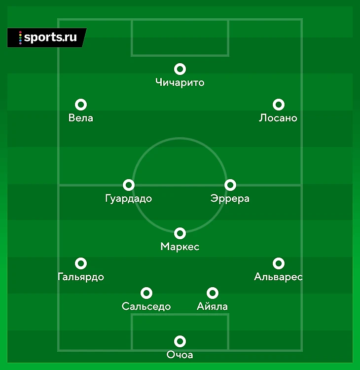 Осорио отреагировал довольно быстро – на 40-й минуте Вела и Лосано поменялись флангами, а сразу после перерыва Маркеса заменил Лайюн. Мигель отправился на фланг обороны, но система Мексики осталась той же – в опорную зону был переведен Альварес (на 55-й минуте его заменил Хонатан дос Сантос).