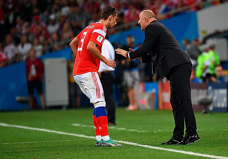 Кто-нибудь помнит, чтобы сборная при Черчесова была так разнообразна до ЧМ? Максимум, на что была способна Россия – перестроиться на четырех защитников вместо пяти во втором тайме ноябрьского матча с Испанией, выпустить вместо второго форварда (после Кубка конфедераций – Кокорина) Алексея Миранчука или уйти от двух опорников в пользу одного разрушителя и двух бокс-ту-боксов. Это не мало. Но на ЧМ ходы Черчесова и его помощников были намного сложнее.