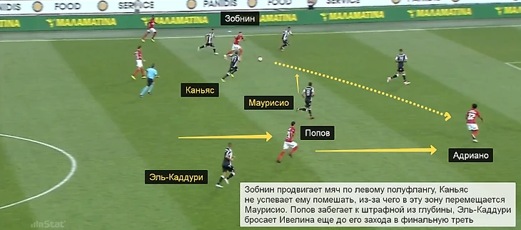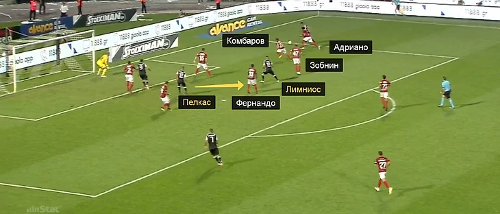 В третьем голе плохо сыграли все – Адриано дал прострелить Матосу, Комбаров и Зобнин вдвоем не смогли перекрыть Лимниоса, из-за чего Фернандо бросился на подстраховку и потерял Пелкаса.