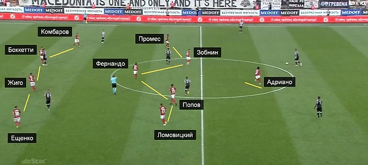 Чаще всего при позиционной обороне «Спартак» выстраивался по 4-1-4-1, в которых Зобнин и Попов отвечали за активный прессинг одного из полузащитников ПАОК (вперед выдвигался тот, в чьем полуфланге начиналась атака греков).