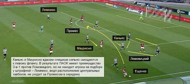 Греки выполнили по 4 навеса с обоих флангов, но с края Ещенко 2 из них были заблокированы (оба – Андреем). С фланга Комбарова все кроссы ПАОК дошли до штрафной (2 – до игроков греков). Виноват в этом не только Дмитрий: Промес просыпал подключения Матоса, а Зобнин не всегда успевал страховать левый край.