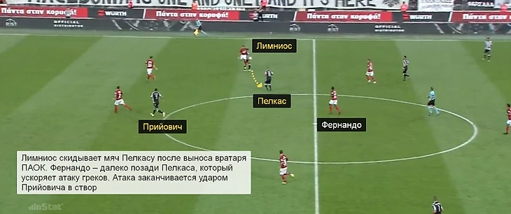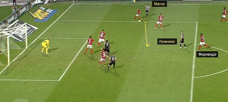 Спартак получает три гола после атак ПАОКа правым флангом.