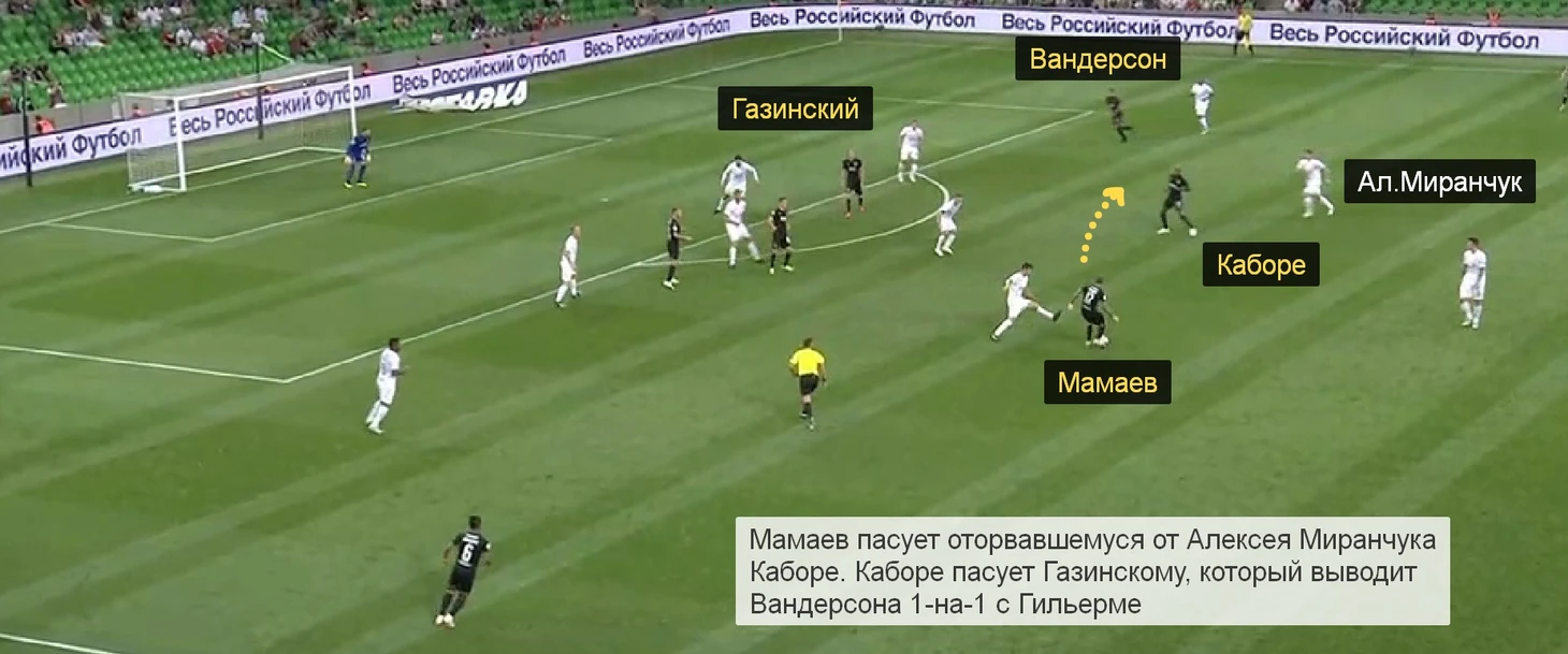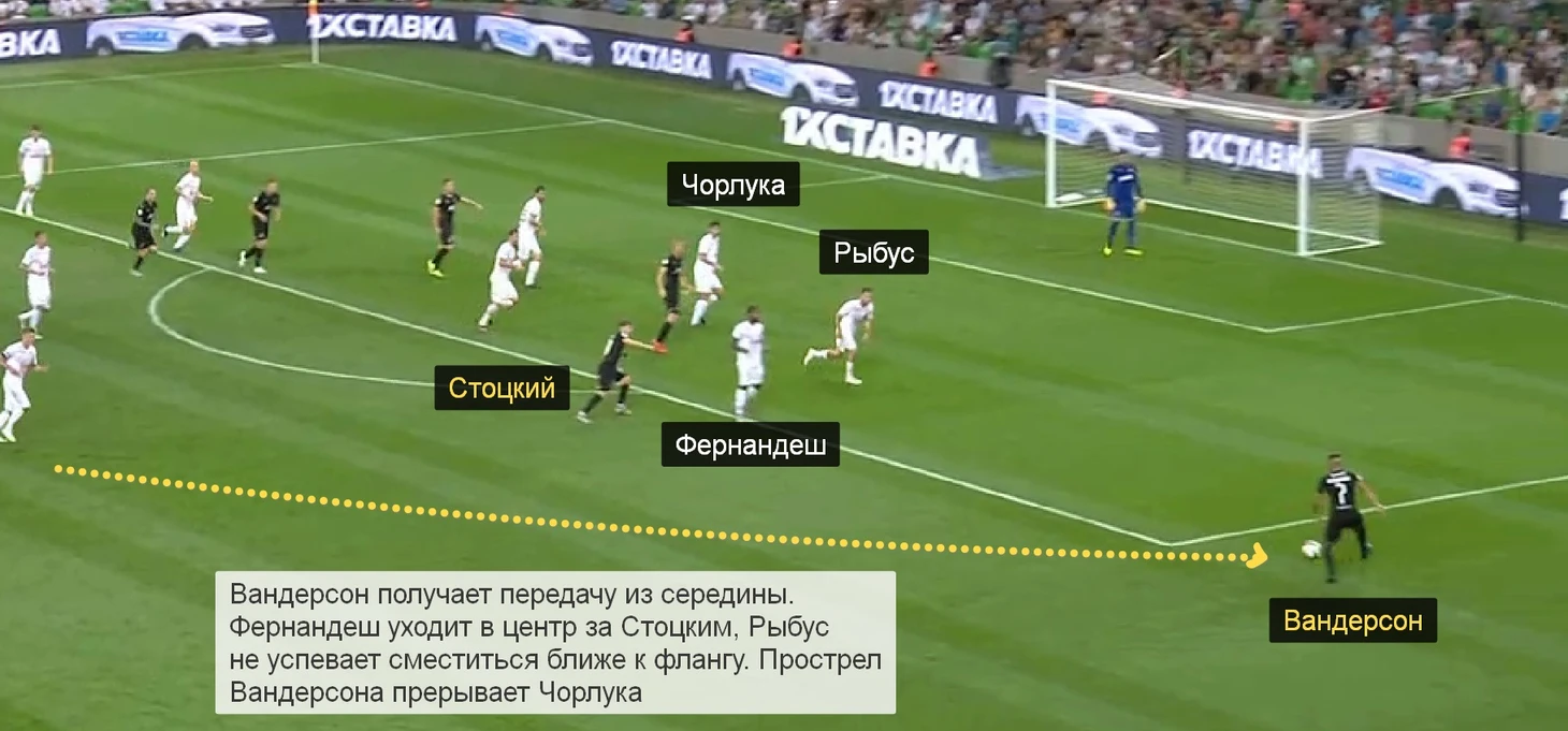 После перерыва Стоцкий сделал 5 кроссов в штрафную, Вандерсон – 4. Большинство из них выполнялось, когда игрокам «Краснодара» никто не мешал: Рыбус не успевал сдвинуться во фланг.