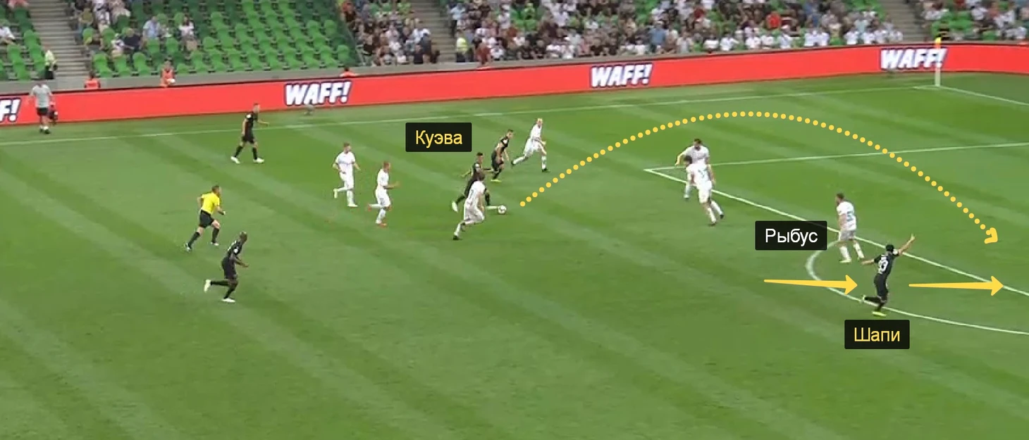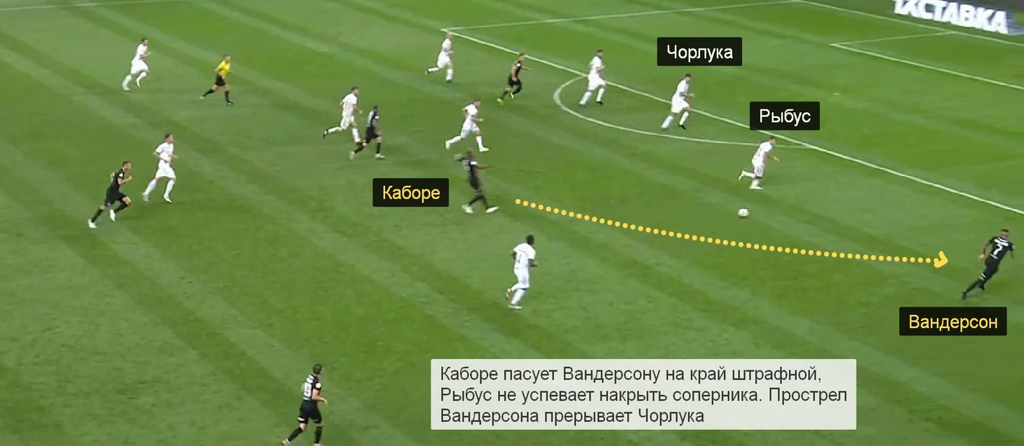13. При втором голе сказалась главная проблема «Локо» в этом матче – узкое расположение фланговых защитников. Рыбус сконцентрировался на мяче и пропустил смещение Шапи в полуфланг.