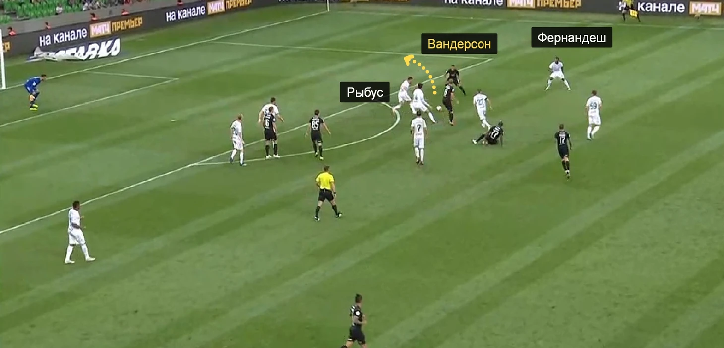 8. Гол Вандерсона пришел как раз из-за специфики расположения Рыбуса и недоработки Фернандеша. Бразилец из «Краснодара» оказался в зоне между левым защитником и полузащитником «Локо» и без проблем пробил Гильерме.