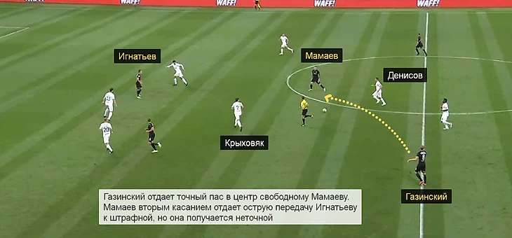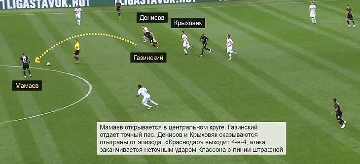 3. Из-за того, что Каборе и Газинский не всегда могли свободно продвигать мяч к финальной трети, в глубину опускался Мамаев. У Павла никаких проблем с опекой не возникало – Крыховяк и Денисов за ним к центральному кругу не уходили. Когда Мамаев получал мяч в средней трети, Газинский поднимался ближе к штрафной «Локо».
