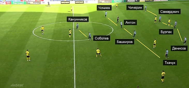 В прошлом туре «Локо» в матче с «Анжи» попробовал 4-3-3 без мяча. Теперь в игре против махачкалинцев экспериментировали «Крылья» – Самара впервые после возвращения в РПЛ сыграла в четыре защитника. Полуяхтов оказался в запасе, в пару к Соболеву вышел Канунников, а Чочиев переместился из центра на правый фланг полузащиты. Получились классические 4-4-2.
