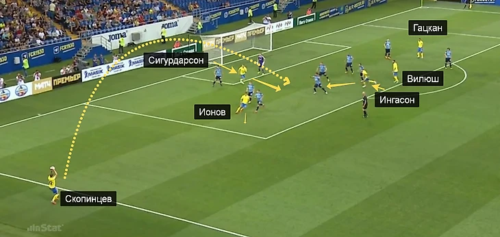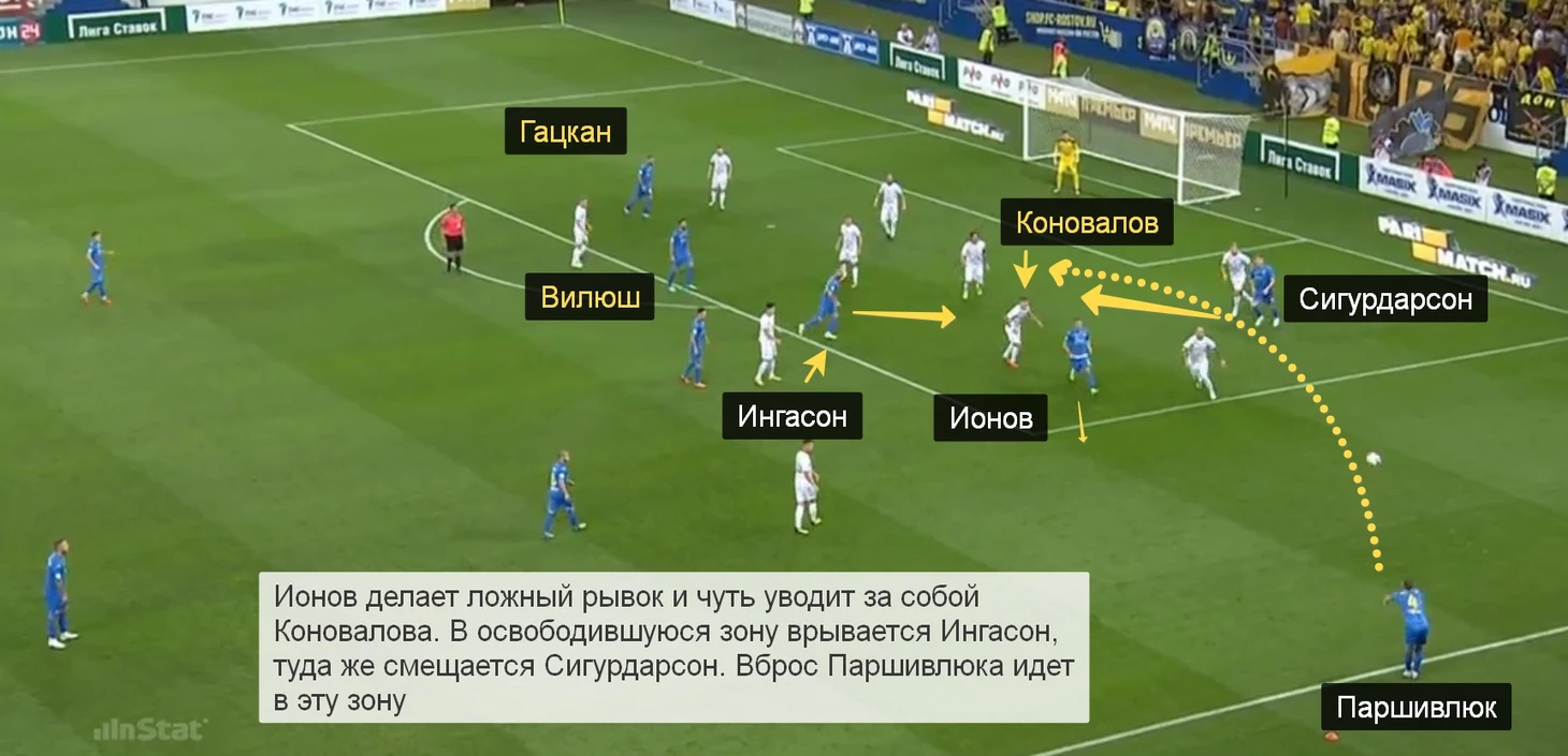 Центральный нападающий (Сигурдарсон или Шомуродов) борется вместе с Ингасоном на ближнем углу (вброс идет именно в эту зону), а Ионов открывается под короткий розыгрыш, уводя за собой из штрафной одного защитника. Дальше всех от вброса аута находится Гацкан.