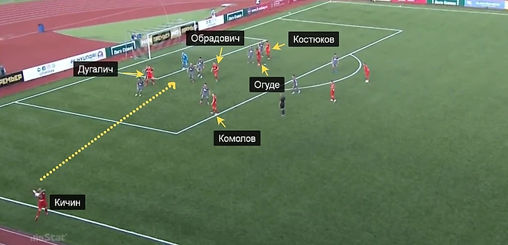 У «Енисея» большая часть опасных аутов идет слева от Кичина. В штрафной соперника располагаются пять игроков: Павел Комолов всегда отвечает за подбор, Раде Дугалич – за ближнюю штангу, оставшиеся три игрока – Фегор Огуде и пара форвардов.