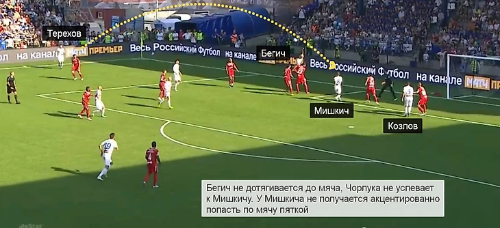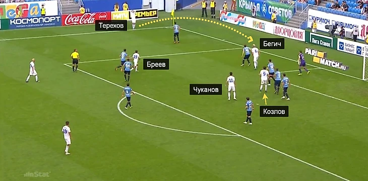 В помощь к Андрею Козлову приходит центральный защитник Сильвие Бегич, который располагается у ближней штанги – на боснийца шли три вброса Терехова.