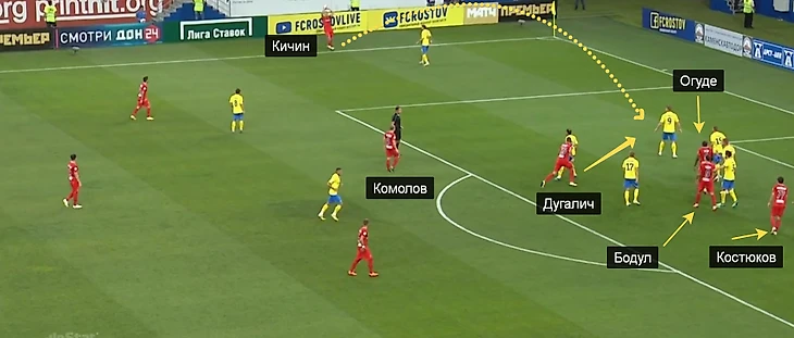 «Ростов» – единственная команда лиги, в которой на ауты у чужой штрафной всегда приходят два центральных защитника (Сверрир Ингасон и Мачей Вилюш). У них разные роли: Ингасон врывается на ближний угол вратарской, а Вилюш не меняет позицию (всегда – в центре).