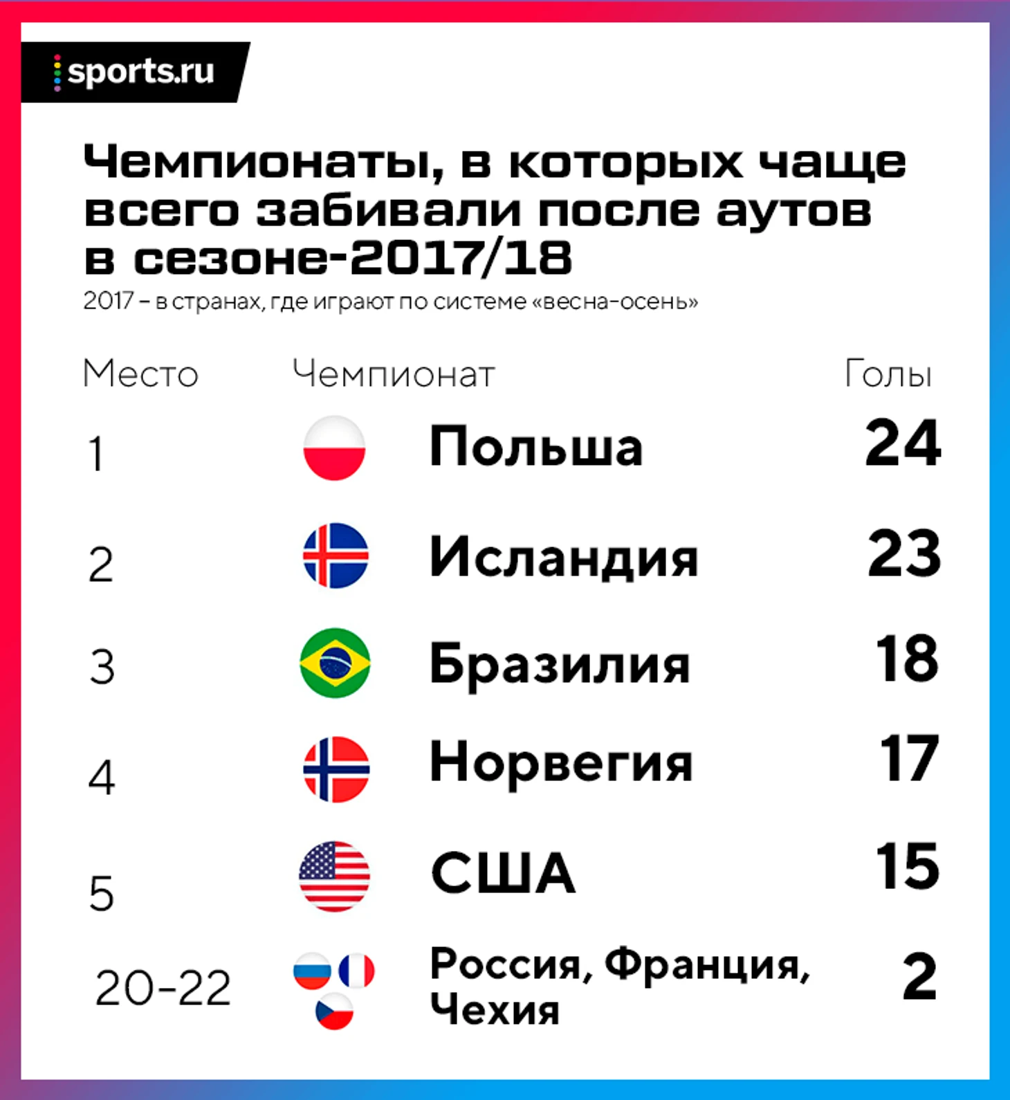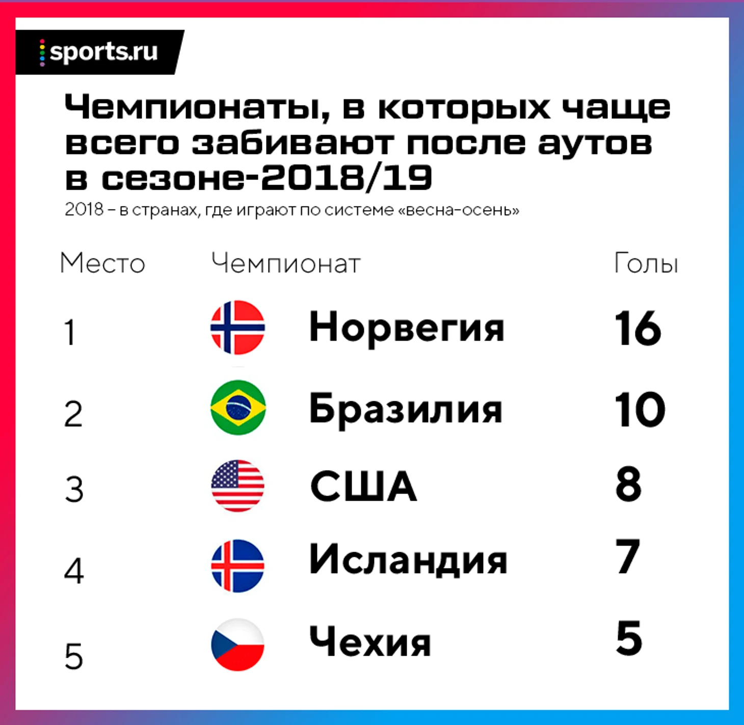 После исторического Евро эффективность аутов Исландии не снизилась – в квалификации ЧМ сборная нанесла 7 ударов после вбросов из-за боковой (лучший результат). В местном чемпионате тоже очень любят ауты – 30 голов за полтора года (чемпионат-2018 еще не окончен). Это второй результат в мире.