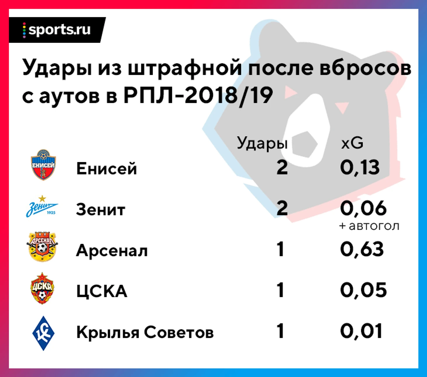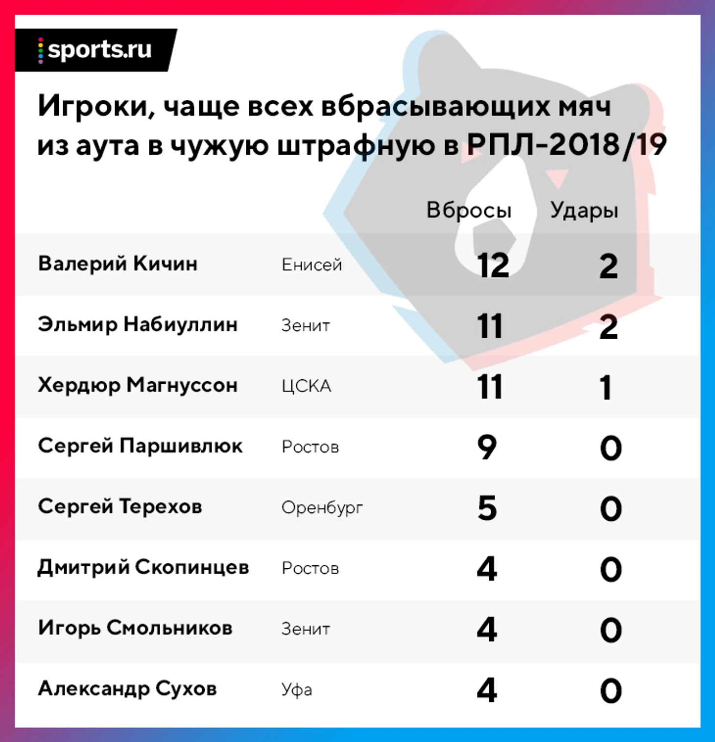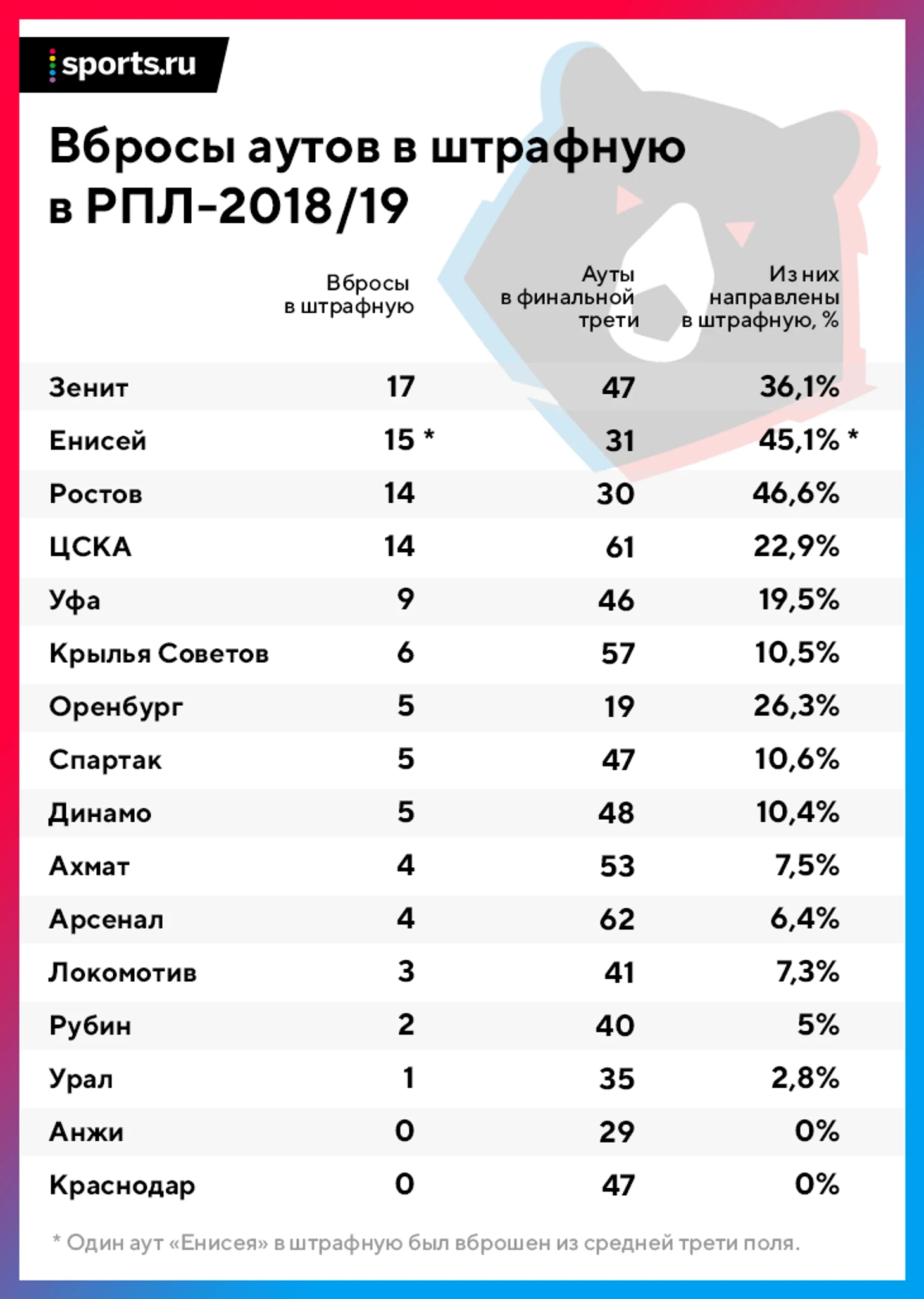 В РПЛ специальных тренеров для аутов нет, но в 2018-м к броскам из-за боковой относятся намного серьезнее. Минимум для четырех команд лиги («Зенит», «Енисей», «Ростов» и ЦСКА) аут стал очень важным стандартом.