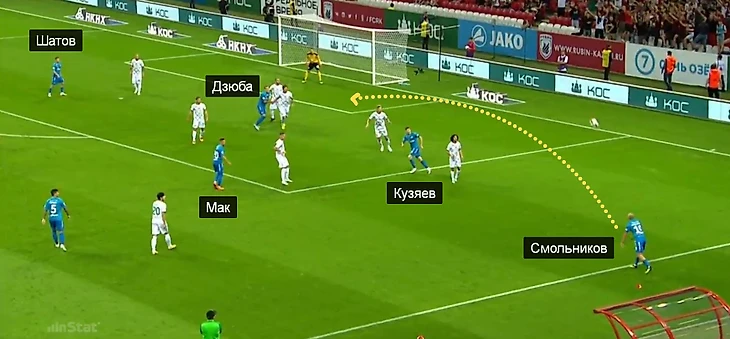 Оба крайних защитника (Эльмир Набиуллин и Игорь Смольников) бросают ауты в штрафную. Вбрасывание всегда идет на Артема Дзюбу – тут соперников нечем удивить.