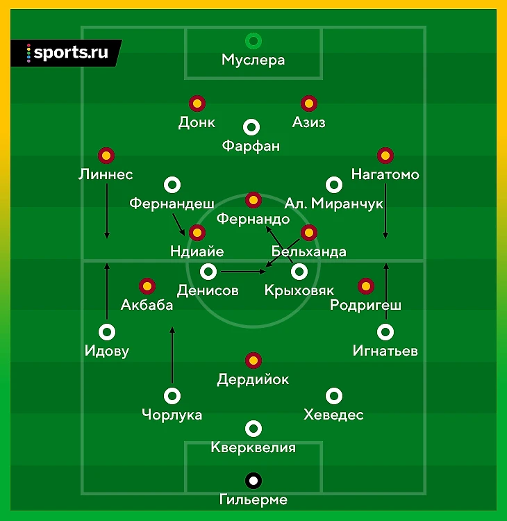 Кроме Идову, впервые в старте чемпиона появился Хеведес. В атаку Семин поставил Фарфана, который с «Динамо» вышел только на замену, потому что отыграл за сборную Перу два матча. Эдера в составе не оказалось – видимо, в прошлом туре он не убедил тренеров.