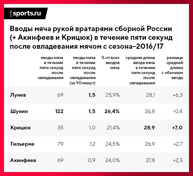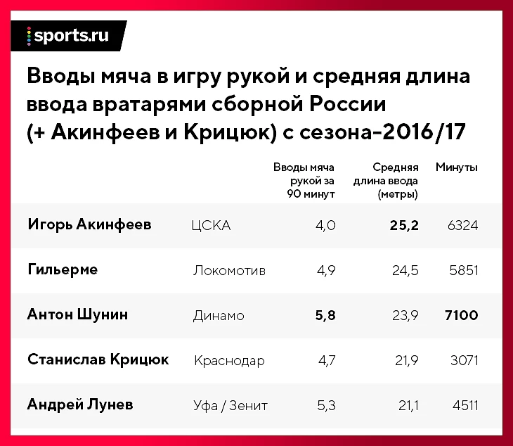 Все пять вратарей на этом отрезке играли разное время (например, Акинфеев – 6324 минуты, а Крицюк – лишь 3071), поэтому правильнее рассматривать не общее число вводов мяча рукой (по ним лидирует Шунин), а среднее за 90 минут.