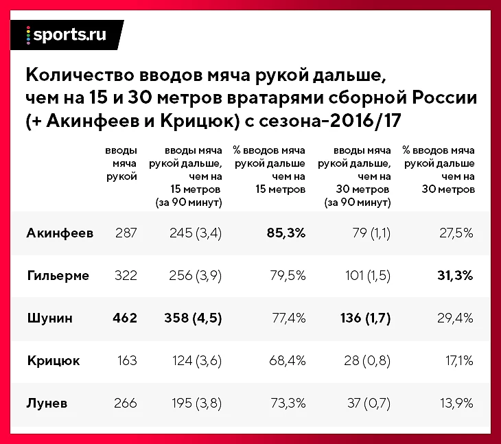 По цифрам Гильерме – самый сбалансированный вратарь сборной России. Во-первых, он лидирует по одному, но очень важному показателю (доля длинных вводов дальше чем на 30 метров), во-вторых, не проседает по другим.