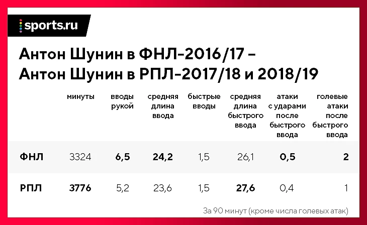 Средняя длина обычного вброса Шунина в РПЛ довольно низкая – при меньшей, чем в ФНЛ, длине ввода, разница в быстром выбросе составляет 1,5 метра в пользу РПЛ. Три показателя (число быстрых вводов, количество атак с ударами, голевые атаки) практически совпадают – год в ФНЛ не дал Шунину серьезного статистического преимущества перед другими кандидатами в сборную.