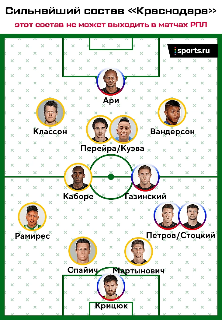 В двух матчах в группе Лиги Европы «Краснодар» выходил с семью иностранцами в старте. Возможно, против «Севильи» это была вынужденная мера (Ари и Игнатьев пропускали матч из-за травм, поэтому в атаке вышел Куэва), однако против «Стандарда» Мусаев мог использовать уже всех, кроме Мамаева. Павел по ходу сезона был переведен с правого фланга на позицию атакующего полузащитника – теперь на это место претендуют два иностранца Перейра и Куэва.