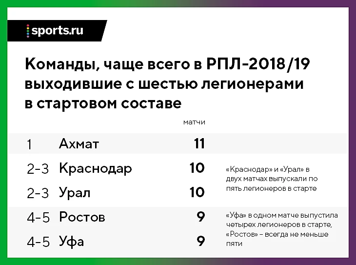 В этом сезоне «Краснодар» делит второе место в лиге по количеству матчей, в которых в старте выходило максимальное число легионеров (6).