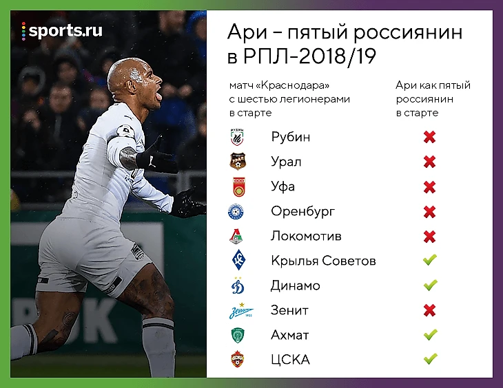 Проблемы «Краснодара» могли бы быть еще глубже, но 9 августа Ари перестал считаться легионером. РФС удовлетворил заявление краснодарцев очень своевременно: старт сезона Ари пропустил из-за травмы (в атаке играли Смолов или Игнатьев), а к середине августа новый русский бразилец как раз вернулся в общую группу. Уже 13 августа Ари вышел на замену в матче с «Уфой», а 18-го – в старте против «Спартака» (с тех пор нападающий выходил только с первых минут).