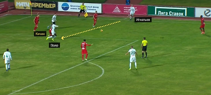 Уже в следующем туре против «Енисея» «Локо» снова забил после аута – и снова выброс делал Игнатьев. На этот раз правый защитник москвичей сделал передачу Эдеру, который находился спиной к чужим воротам – такой розыгрыш аута у «Локо» я разбирал полтора месяца назад.