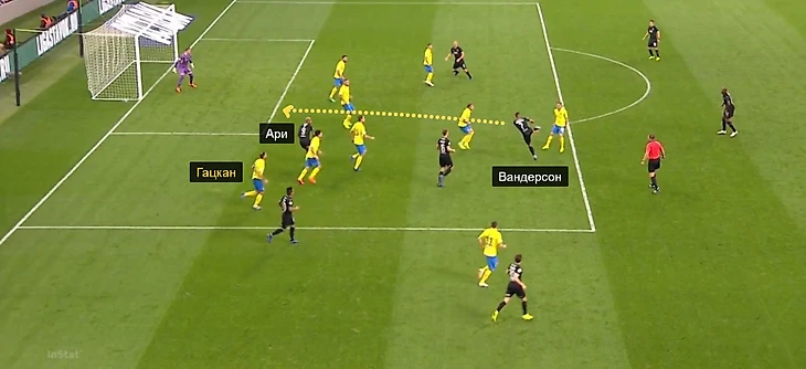 Мяч отскочил к Вандерсону, который неудачно пробил слета. Гацкан не успел выйти за партнерами – так Ари избежал офсайда и забил второй мяч.