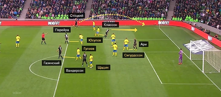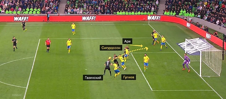 Газинский сбросил мяч к левой штанге, а Ари выскочил из-за спины Сигурдссона и забил первый гол «Краснодара».