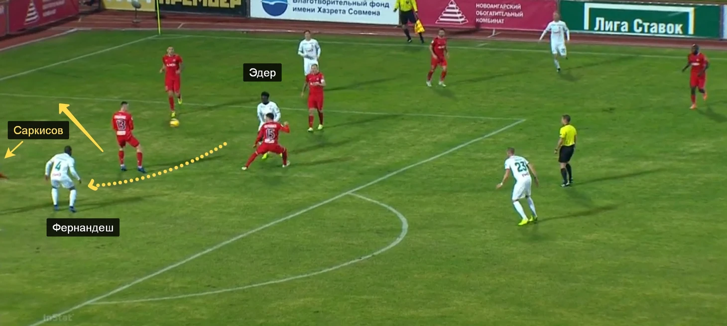 Эдеру удалось развернуть Кичина и протолкнуть мяч на Фернандеша, который опередил Саркисова и вышел один на один с Филипповым.