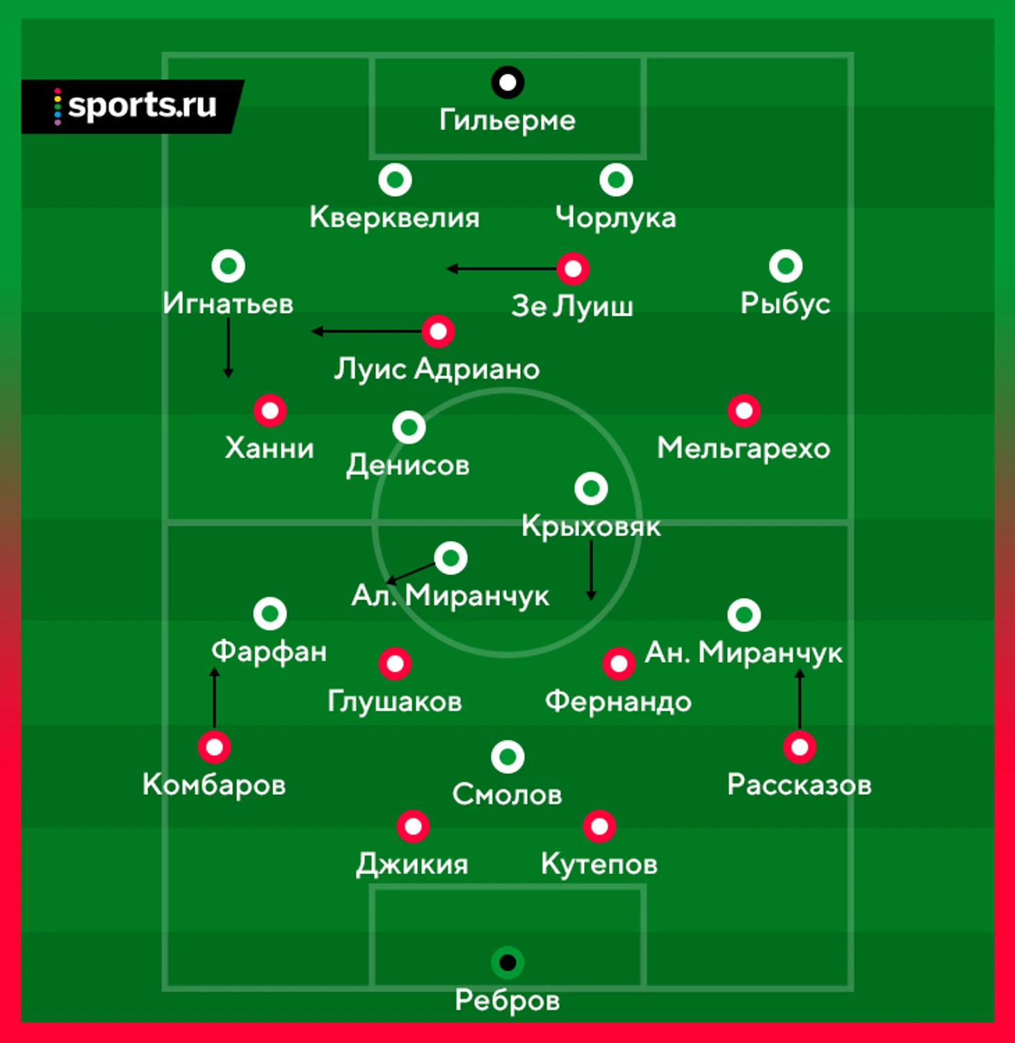 Мельгарехо несколько раз грамотно уходил с правого фланга в середину, но партнеры игнорировали Лоренсо. За первый тайм парагваец совершил только 1 касание в правом полуфланге в средней трети поля – это был обратный пас назад Кутепову.