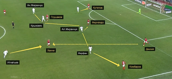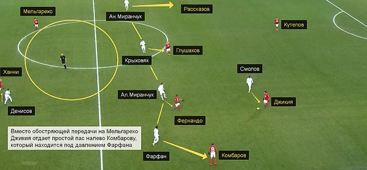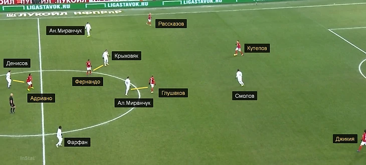 Визуально их было больше (InStat насчитал 8), и почти все из них были одинаковыми – Рассказов уходил от Антона Миранчука с правого фланга в середину. Это происходило и под давлением на половине «Спартака», и на границе чужой финальной трети, когда Рассказов продвигал мяч к штрафной Гильерме.