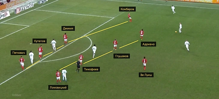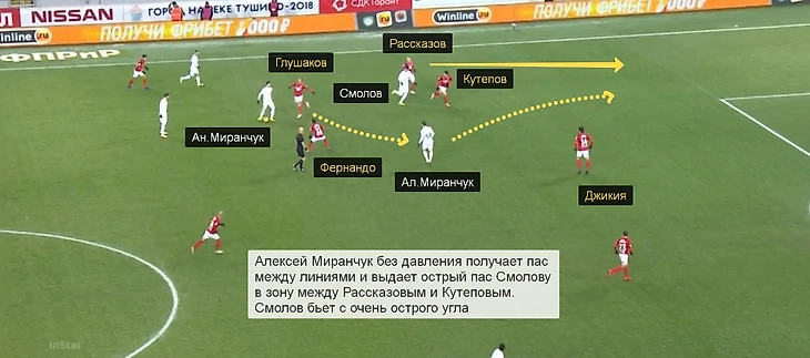 Визуально эти эпизоды были похожи, но на самом деле они были совсем разными. В первом случае «Локо» провел быструю атаку, «Спартак» перестроился (например, Джикия и Кутепов поменялись местами), а выбегание в переднюю линию Антона Миранчука проспал Рассказов. Во втором провалился уже Кутепов – сначала не прервал передачу на Алексея Миранчука, а потом был им обыгран.
