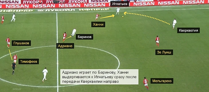 Баринов сделал голевую передачу, но это произошло уже после того, как «Спартак» остался в меньшинстве, а Адриано перевели налево.