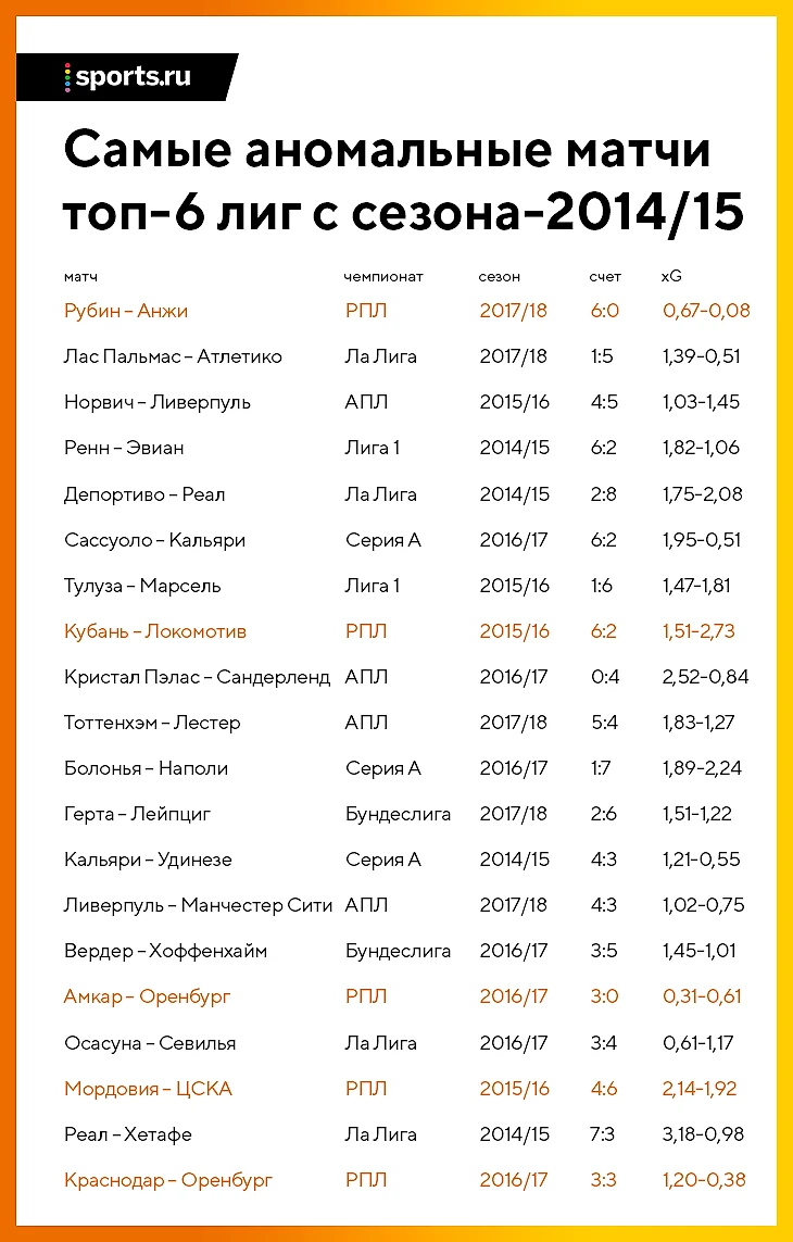 Важно! Речь идет не о договорняках или о подозрениях на них, а о матчах, в которых итоговый результат максимально разошелся с ходом игры и данными продвинутой статистики. Это вполне нормально и укладывается в теорию вероятностей.