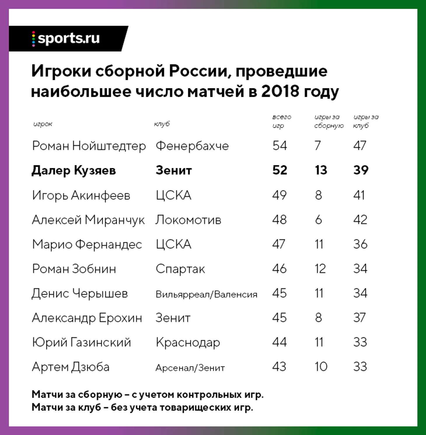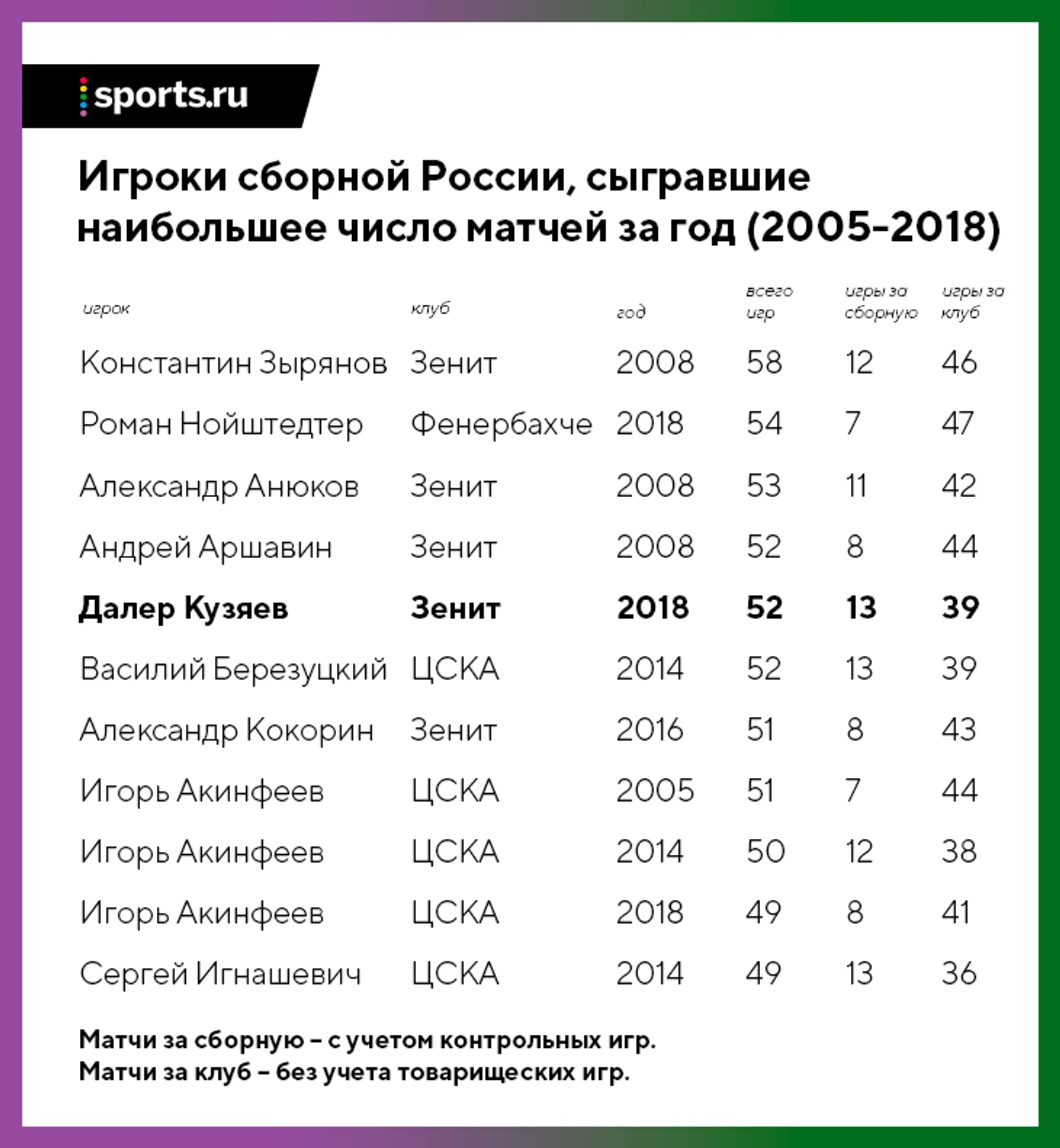 Далер провел 52 матча за год – это лучший результат России, но в сборной есть один игрок, который сыграл еще больше.