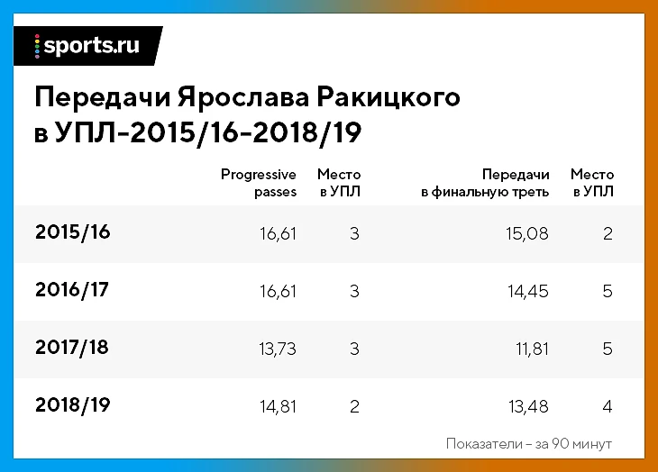 63,7% длинных передач Ракицкого – точные, именно они позволяли бывшему защитнику «Шахтера» быть в лидерах чемпионата Украины по progressive passes (пас, который продвигает мяч на 30 метров при передаче со своей половины, на 15 – при переходе половины, на 10 – на чужой) и передачам в финальную треть.