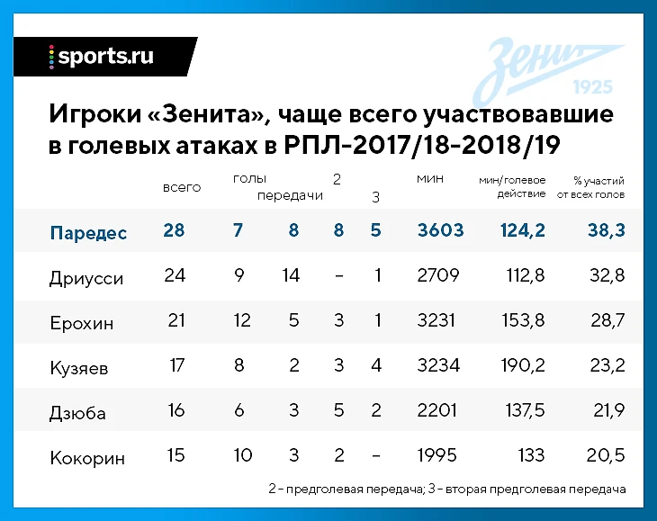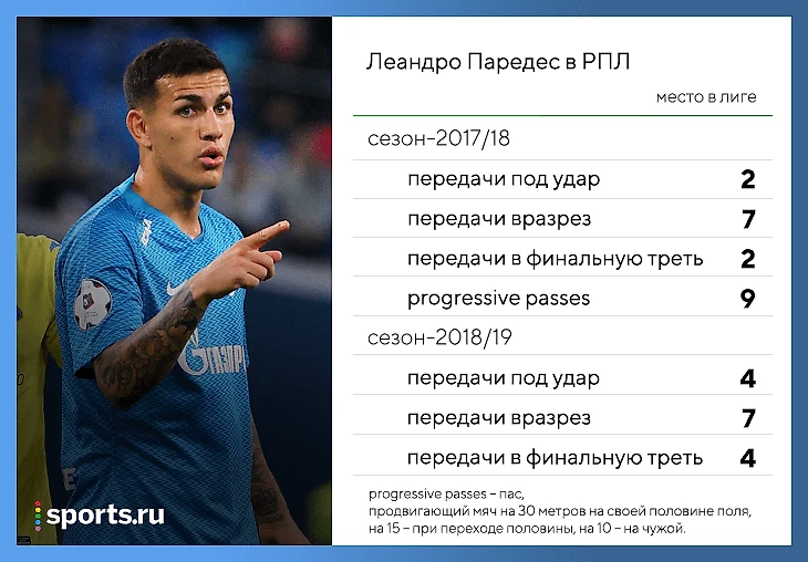 В сезонах-2017/18 и 2018/19 Паредес был самым пасующим игроком «Зенита»: 67,9 передач за 90 минут год назад (6-е место в РПЛ), 63,1 – сейчас (7-е место среди тех, кто сыграл больше 900 минут). Большинство этих передач были сделаны еще со своей половины поля – за счет них «Зенит» продвигал мяч между линиями соперника. 8 голевых передач Лео (второй показатель в команде) не должны смущать – с игры была сделана только 1 из них (Кузяеву в матче с «Арсеналом» в апреле 2018-го).