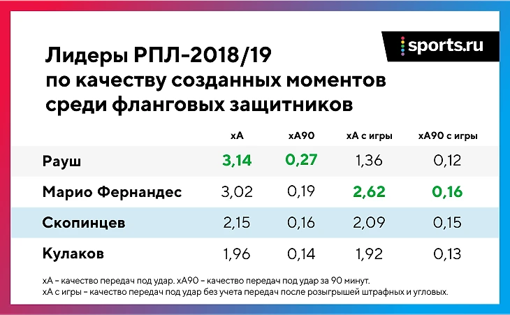 Из фланговых защитников больше Скопинцева с игры создает только Марио Фернандес – слева новичок «Краснодара» лучший. Константин Рауш добирает за счет стандартов: 4 его подачи с угловых и 1 со штрафного были опаснее 12 передач под удар с игры.