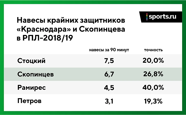 Скопинцев отдает 4,5 передачи в штрафную за 90 минут, основной левый защитник «Краснодара» Рамирес – 4,1. Из-за особенностей схемы и слабой позиционной атаки у «Ростова» передачи Скопинцева были не слишком разнообразны – из 61 передачи лишь 1 стала скрытым пасом назад (на Зуева в матче с «Крыльями Советов»). Характер передач Рамиреса немного другой: он сделал 7 вертикальных передач по флангу за спины защитникам, под которые забегали Классон, Перейра, Вандерсон и Куэва.