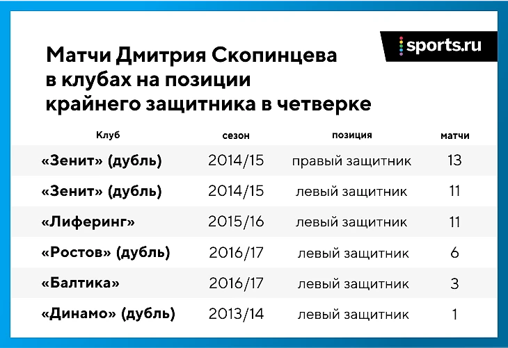 Тот же фактор, что и при потенциальном переходе в «Зенит» или «Спартак» – адаптация Скопинцева к расстановке с четырьмя защитниками. В этой формации Дмитрий пока провел слишком мало матчей – и вообще ни одного в РПЛ.