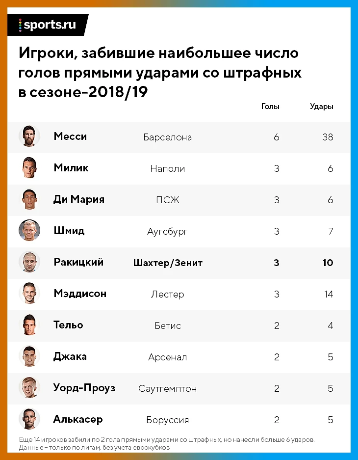3 гола ударами со штрафных – один из лучших результатов европейского сезона. Больше забил только Месси (6), столько же – Милик, Ди Мария, Шмид и Мэддисон, при этом полузащитник «Лестера» затратил больше ударов.