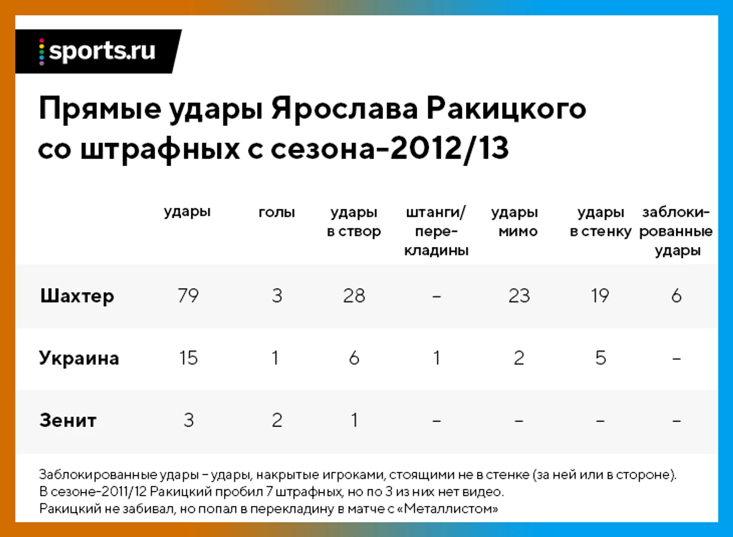 Ярослав пробивает штрафные с сезона-2011/12, но из 7 ударов по трем нет видео – полные данные есть только с сезона-2012/13. Точно известно, что в сезоне-2011/12 Ракицкий не забивал прямыми ударами со штрафных, а самым опасным получился удар в матче с «Металлистом»: защитник пробил на силу сквозь стенку и попал в перекладину.