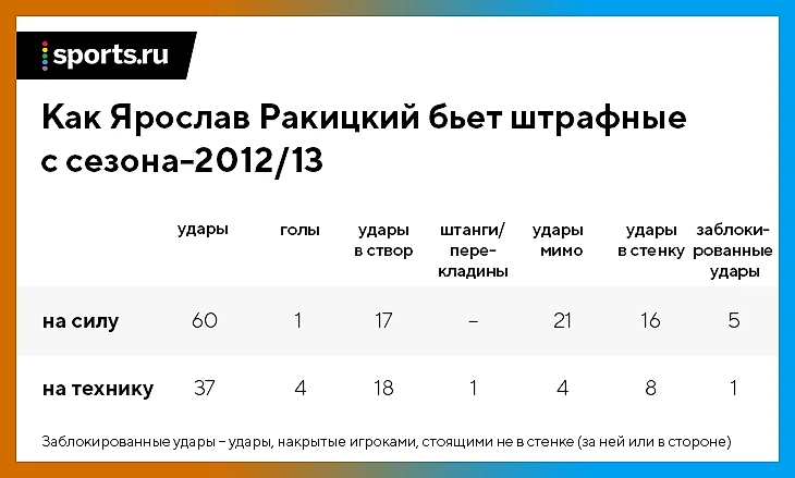 Если Ракицкий попадал в створ ударом на силу, это было очень опасно – даже если удары приходились прямо по центру ворот, вратари не рисковали забирать мяч намертво. Проблема была лишь в одном: 70% ударов Ракицкого на силу (42 из 60) не долетали до створа. За карьеру Ярослав забил лишь 1 гол со штрафного ударом на силу: киевскому «Динамо» в сезоне-2017/18.