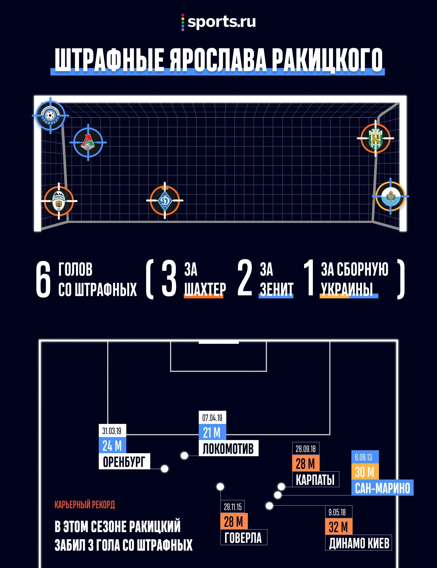 «Ракицкий умеет так пробивать стабильно, хотя мне было бы лучше сказать, что это временная вспышка», – пошутил Сергей Семак после гола украинца «Оренбургу». У защитника действительно поставлен удар, но до «Зенита» он забил всего 4 гола прямыми ударами со штрафных. Для сравнения: полузащитник «Спартака» Фернандо забил столько же только за прошлый сезон.