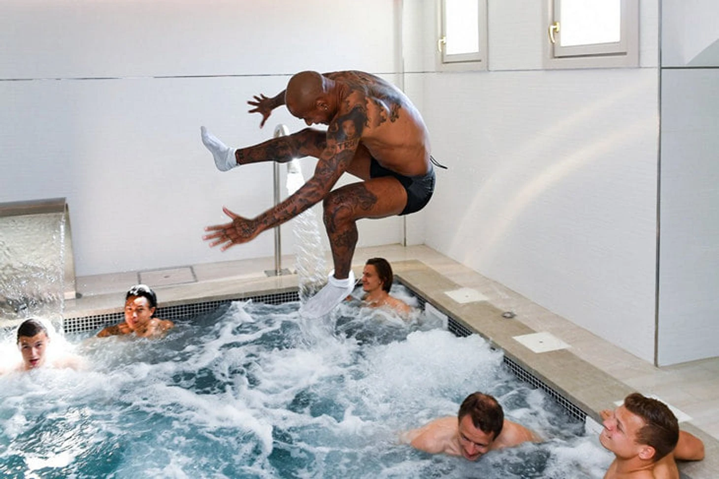 Олег Петрович Фоменко искал тренажерку, не заметил брезента – сделал пару шагов по нему и ушел под воду. В этот момент мимо бассейна проходили игроки – естественно, все стали смеяться, снимать видео.